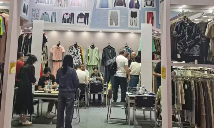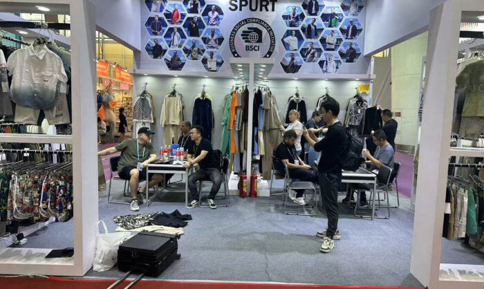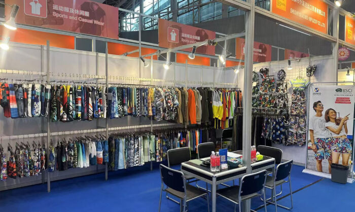 We are here again at the 136th Canton Fair. This time, our main products are still sports suits and cargo pant and shorts, which are our strong productions.